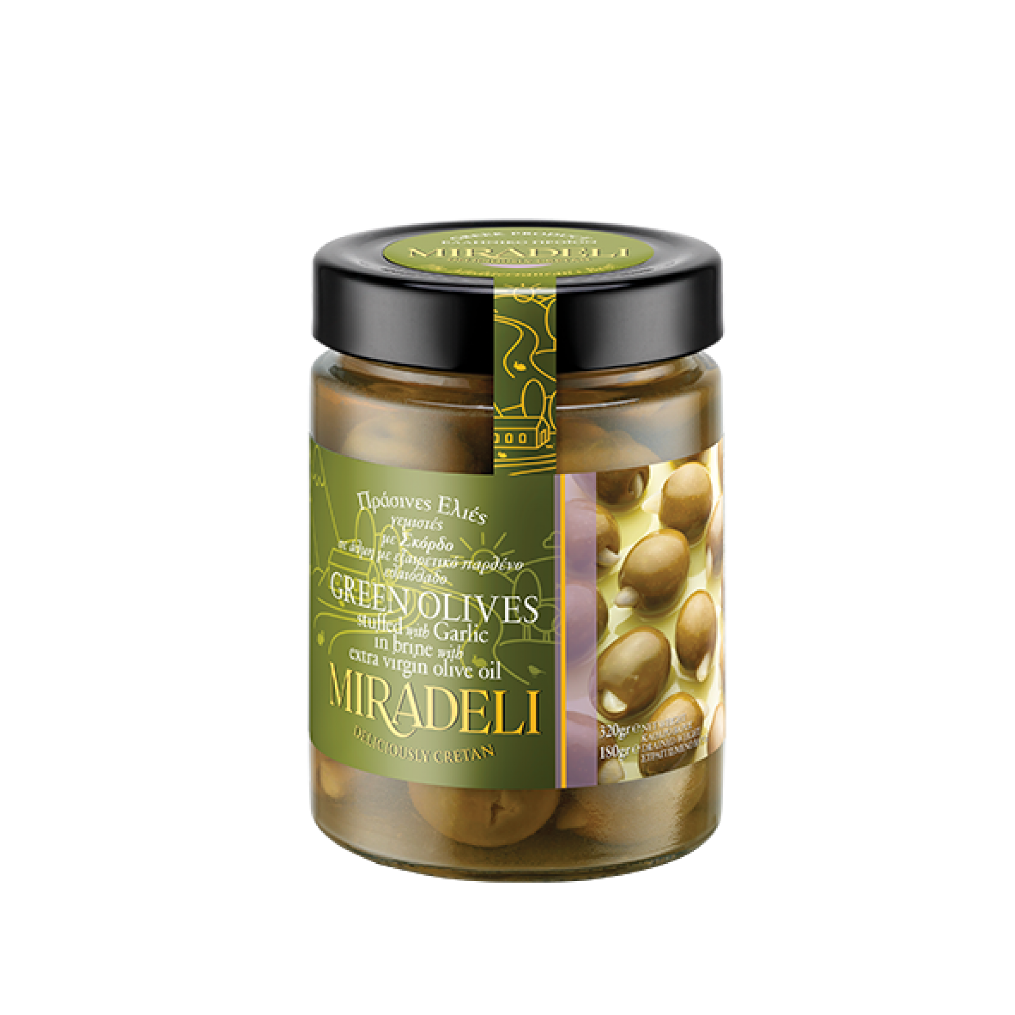 Sočne i hrskave zelene masline, punjene bijelim lukom, konzervirane u slanoj otopini s dodatkom ekstra djevičanskog maslinovog ulja. Kombinacija intenzivnog okusa masline i aromatičnog bijelog luka čini ovaj proizvod savršenim dodatkom uz razna jela ili kao gurmanski zalogaj.